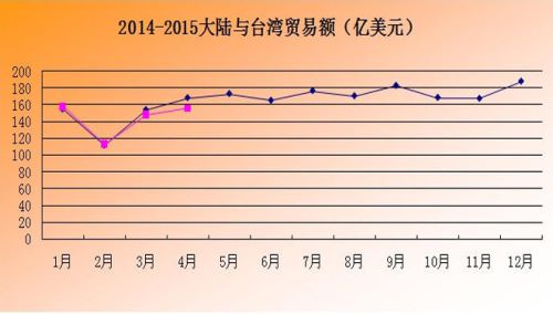 ? ?2015年4月,大陸與臺(tái)灣貿(mào)易額為156.2億美元,同比下降7.3%,環(huán)比上升5.2%。其中,大陸對(duì)臺(tái)灣出口為38.4億美元,同比上升4.6%,環(huán)比上升20.4%;自臺(tái)灣進(jìn)口為117.8億美元,同比下降10.6%,環(huán)比上升1.1%。
